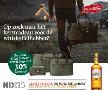 Op de achterzijde van het rugetiket van de Glen Talloch fles vind je nu een unieke actiecode. Daarmee bestel je jouw travel bag met 30% korting via glentallochshop.com